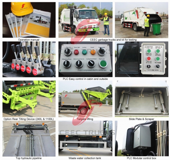 ชุดรถบรรทุกอัดขยะขนาด 12,000 ลิตรมาตรฐานยุโรป ซึ่งใช้ตัวถังอัดวัสดุเหล็กกล้าที่มีความแข็งแรงสูง รุ่น PLC ควบคุมการนำเข้า อุปกรณ์ควบคุมกระบอกไฮดรอลิก กล่องควบคุมเวอร์ชันภาษาอังกฤษเพื่อการใช้งานที่ง่ายดาย