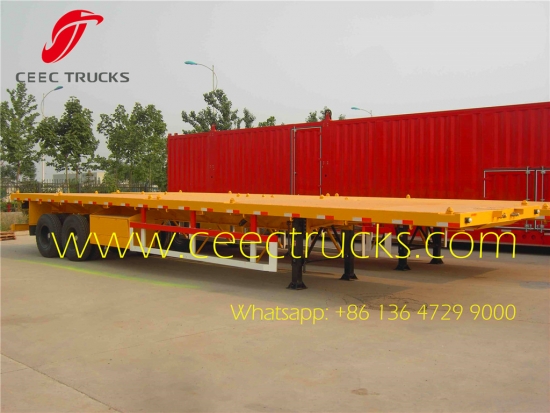 รถพ่วงพื้นเรียบ 2 เพลา 40 ฟุต/รถพ่วงตู้คอนเทนเนอร์แบบแพลตฟอร์มพร้อมโบกี้ รถพ่วงแบบมีโช้คอัพประเภทหนักใช้เพลา BPW และขายึด JOST และขารองรับ สินค้าส่งออกหลักคือเคนยา คองโก แทนซาเนีย เป็นต้น
