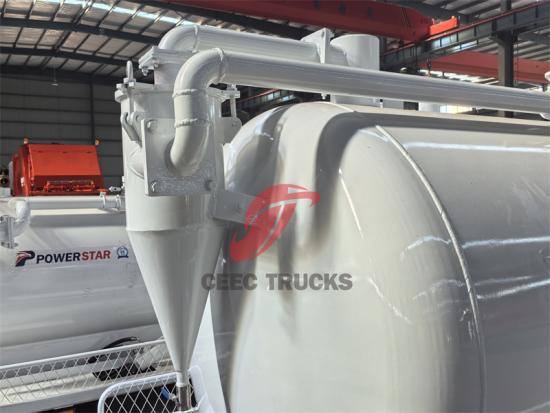 อา— เสริมปั๊มด้วยถังดูดซึ่งเป็นอ่างเก็บน้ำขนาดใหญ่ที่สามารถเก็บน้ำเสียได้ถึง 5,000 ลิตร ความจุขนาดใหญ่ทำให้เป็นสินทรัพย์ที่มีค่าสำหรับการดำเนินงานที่ยาวนานโดยไม่จำเป็นต้องระบายน้ำออกบ่อยครั้ง จึงเพิ่มผลผลิตและประสิทธิภาพสูงสุด ตัวถังดูดมักทำจากแผ่นเหล็กที่มีความแข็งแรงสูงและทนต่อการกัดกร่อน และภายในได้รับการเคลือบสารป้องกันสนิมและป้องกันการกัดกร่อนเพื่อให้เหมาะกับสภาพแวดล้อมที่สัมผัสกับสิ่งสกปรกที่กัดกร่อนเป็นเวลานาน