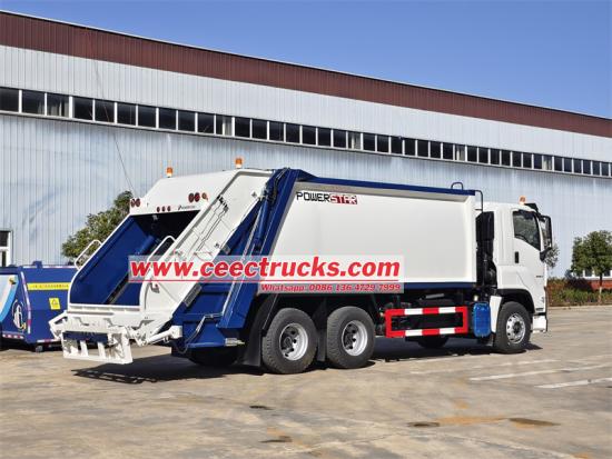 รถบรรทุกอัดขยะ ISUZU GIGA ใช้เกียร์หน้า 12 สปีดและเกียร์หลัง 1 สปีดขั้นสูง ร่วมกับระบบขับเคลื่อน 6*4 เพื่อให้มั่นใจถึงความเสถียรและประสิทธิภาพในสภาพถนนที่ซับซ้อน ตัวถังโค้งขนาด 20 ลูกบาศก์เมตรทำจากเหล็กพิเศษ Q235 ตัวถังหนา 4 มม. และกระบวนการขึ้นรูปโดยรวม อัตราส่วนการบีบอัดสูงถึง 1:3.4 ช่วยให้มั่นใจถึงประสิทธิภาพการบีบอัดขยะสูงสุด ระบบควบคุมไฮดรอลิกอัตโนมัติเต็มรูปแบบมีเวลาโหลดและขนถ่ายครั้งเดียวสั้นเพียง 40-45 วินาที และติดตั้งระบบควบคุมอัจฉริยะ PLC ซึ่งใช้งานง่ายและรวดเร็ว ในโหมดแมนนวล ผู้ปฏิบัติงานสามารถใช้คันโยกควบคุมและปุ่มควบคุมไฟฟ้าเพื่อดำเนินการต่างๆ เช่น การบีบอัดและขนถ่ายช่องขยะให้เสร็จสิ้น