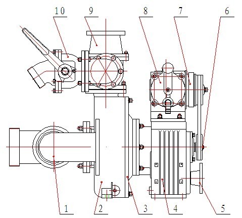 1 วาล์วสามทางเข้า 2 เปลือก 3 ฝาครอบด้านหลัง 4 กระปุกเกียร์ 5 หน้าแปลนข้อต่อเพลา 6 สายพาน 7 คลัตช์แม่เหล็กไฟฟ้า 8 ปั๊มไพรเมอร์ลูกสูบ 9 วาล์วแรงดันย้อนกลับ 10 วาล์วลูกบอลทางออก