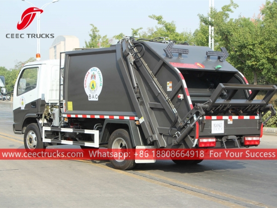 รถบรรทุกอัดขยะ Dongfeng ขนาด 6 ลูกบาศก์เมตรของแกมเบีย ตัวถังรถบรรทุกใช้เครื่องยนต์ดีเซล YUCHAI 115 แรงม้า เกียร์ธรรมดา 5 เกียร์ ระบบควบคุม CAN-BUS เพื่อการใช้งานที่ง่ายดาย งานพ่นสีและโลโก้ทั้งหมดขึ้นอยู่กับความต้องการของลูกค้า