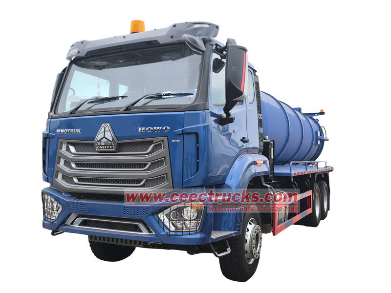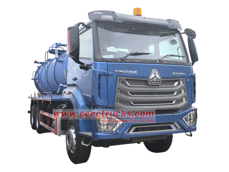 รถบรรทุกถังบำบัดน้ำเสียแบบสุญญากาศ Howo ขนาด 15 cbm ได้รับการปรับเปลี่ยนบนพื้นฐานของแชสซี HOWO NX Cabin 6x4 โดยมีฐานล้อ 4325 + 1350 มม. ยาง 315/80R22.5 จำนวน 11 ชิ้น พร้อมเครื่องปรับอากาศ USB และระบบช่วยควบคุมทิศทาง ติดตั้งเครื่องยนต์ดีเซล WP12.400E32 ขนาด 400 แรงม้า เกียร์ HW19710 เกียร์เดินหน้า 10 เกียร์ เกียร์ถอยหลัง 2 เกียร์ พวงมาลัย ZF8118 ซึ่งทรงพลังและใช้งานง่าย ยานพาหนะติดตั้งถังสุญญากาศขนาด 15 cbm ซึ่งสามารถตอบสนองความต้องการในการขุดลอกต่างๆ เช่น ท่อระบายน้ำในเมืองและท่อส่งอุตสาหกรรม