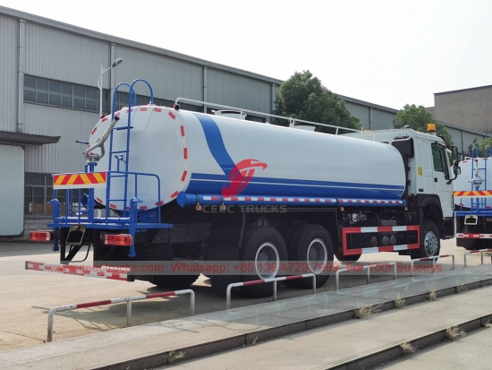 รถบรรทุกฉีดพ่นน้ำ HOWO 20,000 ลิตร แชสซี HOWO 6x4 เกียร์ธรรมดา 10 เกียร์ เครื่องยนต์ดีเซล WEICHAI 336 แรงม้า ปั๊มน้ำยี่ห้อดัง พร้อมหัวฉีดฉีดพ่นด้านหน้า ตรงกลาง และด้านหลังตามตัวเลือก การพ่นสีและโลโก้ทั้งหมดขึ้นอยู่กับความต้องการ