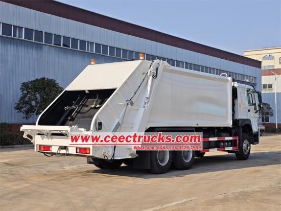 รถบรรทุกบดอัดท้าย HOWO 6x4 20cbm ใช้สำหรับสุขาภิบาลเทศบาล ซึ่งได้รับการดัดแปลงมาจาก HOWO 6x4ฐานล้อ 4,600+1,350 มม. พร้อมเครื่องยนต์ WP10.340 340 แรงม้า 6 สูบแถวเรียง สี่จังหวะ ซูเปอร์ชาร์จและอินเตอร์คูลเลอร์9.726 ลิตรกระปุกเกียร์ HW19710 10 สปีดแอร์, USB, ระบบช่วยควบคุมทิศทาง ถังขยะบนรถบรรทุกมีความจุ 20 ลูกบาศก์เมตร เพื่อบีบอัดขยะให้มากขึ้น