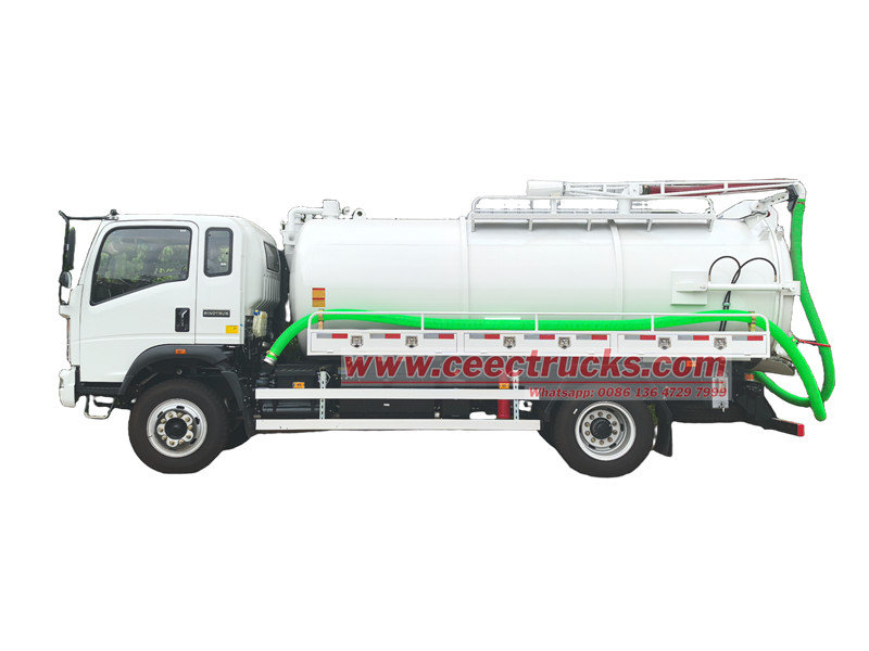 รถบรรทุกถังบำบัดน้ำเสียแบบเพลาเดี่ยว Howo 5,000 ลิตร (เรียกอีกอย่างว่า รถบรรทุกปั๊มดูดสุญญากาศ Howo 5cbm, รถบรรทุกถังสูญญากาศ Howo 5,000 ลิตร, รถบรรทุกปั๊มถังบำบัดน้ำเสีย Howo 4x2, รถบรรทุกปั๊มถังบำบัดน้ำเสีย Howo 6 ล้อ, รถบรรทุกดูดสิ่งปฏิกูลสุญญากาศ Howo) ใช้สำหรับรวบรวม ขนส่ง และระบายของเหลว เช่น น้ำสกปรก ตะกอน และน้ำเสีย ตัวถังได้รับการเคลือบสารป้องกันการกัดกร่อนและสนิม และมีความทนทานสูง ผสานกับปั๊มสุญญากาศกำลังสูง จึงมีแรงดูดสูง และเป็นอุปกรณ์ระดับมืออาชีพที่ขาดไม่ได้ในการบริหารจัดการสิ่งแวดล้อมทั้งในเมืองและชนบท