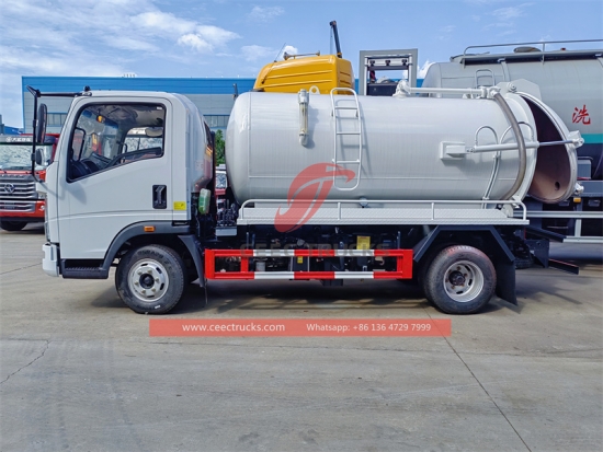 รถบรรทุกดูดน้ำเสียแบบสูญญากาศ HOWO 5cbm รุ่น HOWO พวงมาลัยขวา แชสซี 4x2 เกียร์ธรรมดา 5 เกียร์คัมมินส์เครื่องยนต์ดีเซล 141 ปั๊มสุญญากาศยี่ห้อดังของจีน งานพ่นสีและโลโก้ขึ้นอยู่กับความต้องการ