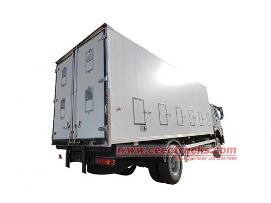 รถบรรทุกห้องเย็น Howo 4x2 ใช้แชสซีส์ห้องโดยสารด้านหน้าแบบใหม่ของ Howo HW76 พร้อมฐานล้อขนาด 4,600 มม. มาพร้อมเครื่องยนต์ Weichai WP10.340E22 340 แรงม้า และระบบส่งกำลัง Sinotruk HW19710 10 สปีด ตัวถังห้องเย็นมีขนาด 6,500 × 2350 × ขนาด 2,500 มม. ผลิตจากไฟเบอร์กลาส ผสมวัสดุ FRP + โฟม PU + แผง FRP หนา 105 มม. ประกอบด้วยแผงแซนด์วิชปิดสนิท ประตูเปิดด้านขวา ประตูหลังคู่ขนาดมาตรฐาน และพื้นกันลื่นทนทานต่อการสึกหรอ ใช้ชุดทำความเย็น CARRIER CITIMAX 1100 แบบแยกอิสระ