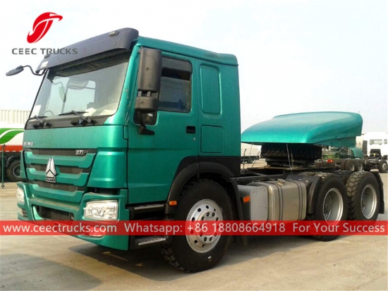 หัวลาก SINOTRUK HOWO 6x4 เครื่องยนต์ดีเซล SINOTRUK 371 แรงม้า เกียร์ธรรมดา 10 เกียร์ น้ำหนักลากจูงสูงสุดสามารถได้ถึง 40,000 กก. งานพ่นสีและโลโก้ขึ้นอยู่กับข้อกำหนด