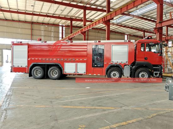 รถบรรทุกดับเพลิงพิเศษนี้สร้างขึ้นบนโครงรถ Howo 8x4 สำหรับงานหนักที่แข็งแรงทนทาน ผสานเครื่องยนต์ทรงพลัง 540 แรงม้า และสามารถบรรทุกถังดับเพลิงขนาดใหญ่เพื่อรับมือกับสถานการณ์ที่ยากลำบากบนท้องถนน และบรรลุวัตถุประสงค์ในการกู้ภัยฉุกเฉินอย่างมีประสิทธิภาพ รถดับเพลิง Howo 8x4 มาพร้อมกับถังน้ำความจุขนาดใหญ่ 6,000 ลิตร ถังโฟมความจุ 2,000 ลิตร และปืนใหญ่ดับเพลิงอิเล็กทรอนิกส์ควบคุมระยะไกลระดับมืออาชีพ ซึ่งสามารถพ่นน้ำได้ไกลถึง 65-85 เมตร แผงควบคุมเป็นอุปกรณ์เสริมที่ใช้งานง่าย ในขณะเดียวกันก็มีตัวเลือกการกำหนดค่าที่หลากหลายเพื่อตอบสนองความต้องการที่แตกต่างกัน รถดับเพลิง Howo สำหรับงานหนักคันนี้ให้การป้องกันที่แข็งแกร่งเพื่อความปลอดภัยจากอัคคีภัย พร้อมประสิทธิภาพและความยืดหยุ่นที่ยอดเยี่ยม