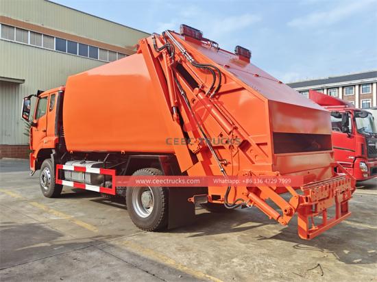 รถบรรทุกอัดขยะ Howo ใช้เกียร์เดินหน้า 10 เกียร์ และเกียร์ถอยหลัง 2 เกียร์ ผสานกับโครงสร้างที่แข็งแรงและพวงมาลัยที่ยืดหยุ่น ช่วยให้มั่นใจได้ถึงการทำงานที่เสถียรและมีประสิทธิภาพในสภาพถนนที่ซับซ้อน รถบดอัดขยะ Howo รุ่น 15 ซีบีเอ็ม ถังทรงโค้ง ผลิตจากเหล็กกล้าพิเศษ Q235 หนา 4 มม. ใช้กระบวนการขึ้นรูปชิ้นเดียว ทำให้มีอัตราส่วนการอัด 1:3.4 มั่นใจได้ถึงประสิทธิภาพการอัดขยะสูงสุด ระบบควบคุมไฮดรอลิกอัตโนมัติเต็มรูปแบบช่วยลดรอบการขนถ่ายขยะลงเหลือเพียง 40-45 วินาที ใช้งานง่ายและรวดเร็วด้วยระบบควบคุมอัจฉริยะ PLC ในโหมดแมนนวล ผู้ปฏิบัติงานสามารถใช้คันโยกควบคุมและปุ่มควบคุมไฟฟ้าเพื่อดำเนินการอัด ขนถ่าย และการทำงานอื่นๆ ของถังเก็บขยะให้เสร็จสมบูรณ์