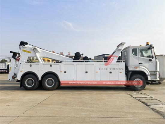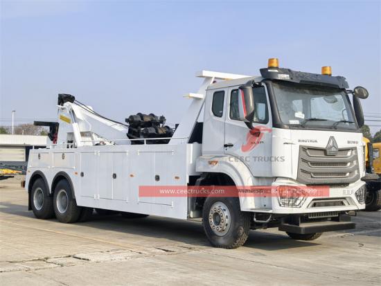 หนักมาก duty wrecker, built by CEEC Trucks Group, utilizes the Howo NX cabin 6 x 4 drive chassis and is equipped with a powerful Howo WP10.340E22 diesel engine (3 4 0 HP /1250N . m of torque) and an HW1 9710 10 -speed transmission. Combined with an HF9-ton front axle and HC16-ton rear axle, it ensures exceptional power, load-bearing capacity, and reliability. It incorporates two 1 2 ton s hydraulic winches, resulting in an impressive rated towing capacity of 30 tons, making it ideal for handling accidents involving large trucks, buses, and construction machinery.