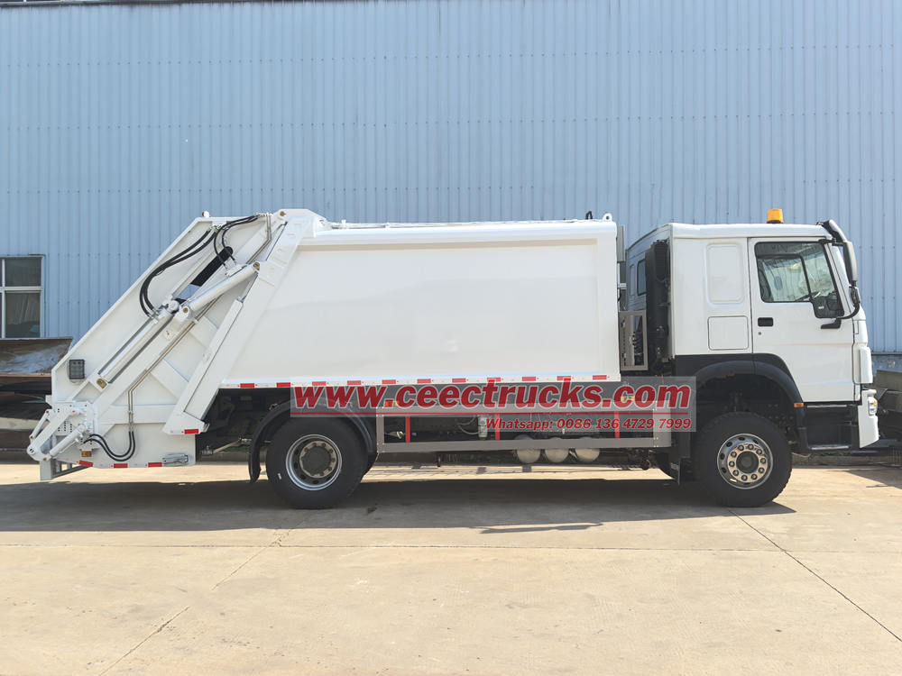 รถบรรทุกอัดแบบตักท้าย HOWO 14cbm เป็นรถที่มีประสิทธิภาพสูงและเชื่อถือได้ ออกแบบมาสำหรับการจัดการขยะในเมืองและชานเมือง ด้วยฐานล้อ 4,600 มม. พร้อมเครื่องยนต์ WP10.300E22 300 แรงม้า ดีเซล Euro 3 ปล่อยไอเสีย 9.726L ชุดเกียร์ HW19710 ยาง 295/80R22.5 จำนวน 7 ชิ้น พร้อมเครื่องปรับอากาศ USB ระบบช่วยควบคุมทิศทาง ที่นั่ง 3 ที่นั่ง ตัวถังส่วนบนเป็นถังขยะขนาด 14cbm ด้านหลังเป็นกลไกพลิกถัง มี 3 วิธีในการโหลดและขนถ่ายสินค้าบนรถบรรทุก