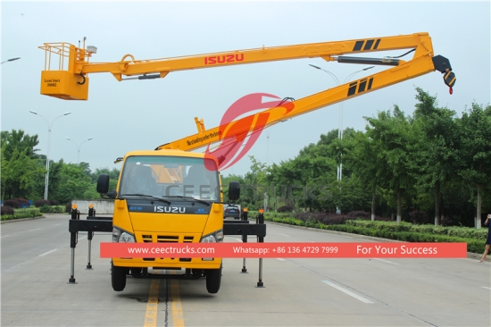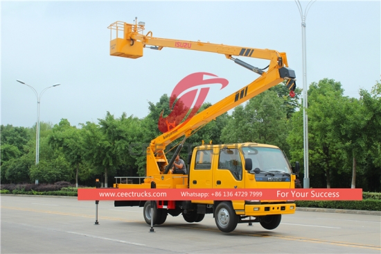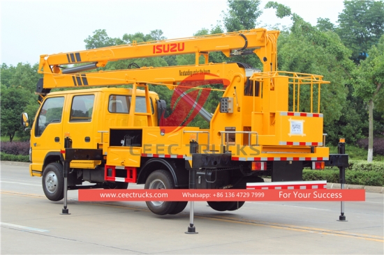 รถบรรทุกยกเครนถัง 16 ม. ISUZU ผู้ผลิตรถบรรทุกแพลตฟอร์มลอยฟ้าระดับพรีเมียม กระปุกเกียร์ธรรมดา 5 เกียร์ เครื่องยนต์ดีเซล ISUZU 98 แรงม้า งานพ่นสีและโลโก้ขึ้นอยู่กับความต้องการ ด้วยเทคโนโลยีล่าสุด CEEC บนแชสซีรถบรรทุกขับเคลื่อน 4*2 ของ ISUZU