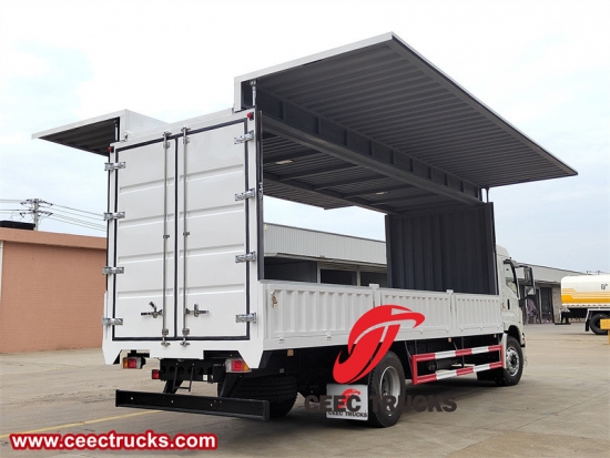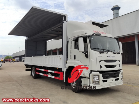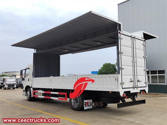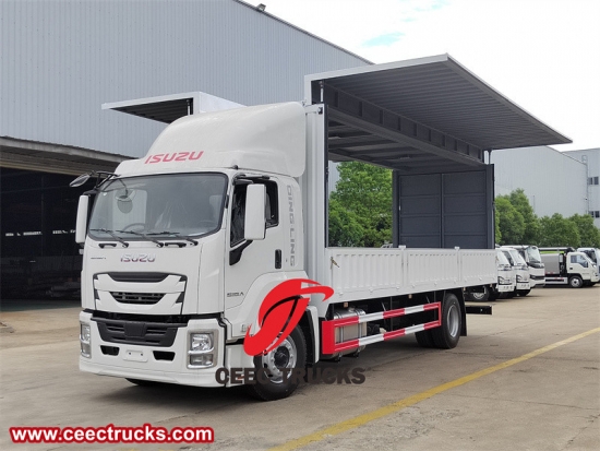 Isuzu Giga 4x2 205HP 6 wheeler Wing Van Truck หรือที่เรียกอีกอย่างว่า Wing-opening van เป็นการพัฒนาจากรถตู้ทั่วไป เป็นรถพิเศษที่สามารถเปิดปีกได้ทั้งสองด้านของตัวรถโดยใช้สปริงไฟฟ้า อุปกรณ์มือ หรืออุปกรณ์ไฮดรอลิก โครงสร้างด้านบน แผงด้านหน้า และประตูหลังของรถเป็นแบบเดียวกับรถตู้ลูกฟูกเหล็ก ส่วนด้านข้างประกอบด้วยแผงพลิก แผงด้านข้างด้านบน และแผงด้านข้างด้านล่าง