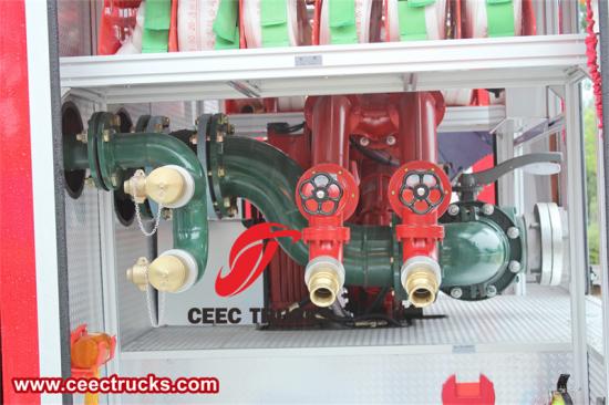 เครื่องเก็บน้ำ : เครื่องเก็บน้ำเป็นอุปกรณ์สำคัญสำหรับรถดับเพลิงในการดูดซับน้ำจากแหล่งน้ำภายนอกได้อย่างรวดเร็ว โดยปกติจะติดตั้งไว้ที่ด้านหน้าหรือด้านข้างของรถ และใช้แรงดูดที่แรงเพื่อดูดน้ำจากแหล่งน้ำ (เช่น ทะเลสาบ แม่น้ำ หรือหัวดับเพลิง) เข้าไปในถังเก็บน้ำเพื่อให้มีน้ำเพียงพอสำหรับปฏิบัติการดับเพลิง