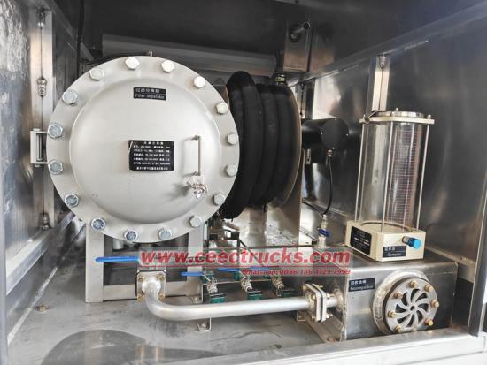 Right side view of the independent room have the most important component of the aviation fuel truck, the fuel filter, which with model CLQ-0090 model, with efficiently flow rate 400Liter per minute, working pressure 1.0Mpa. efficiently and reliable.