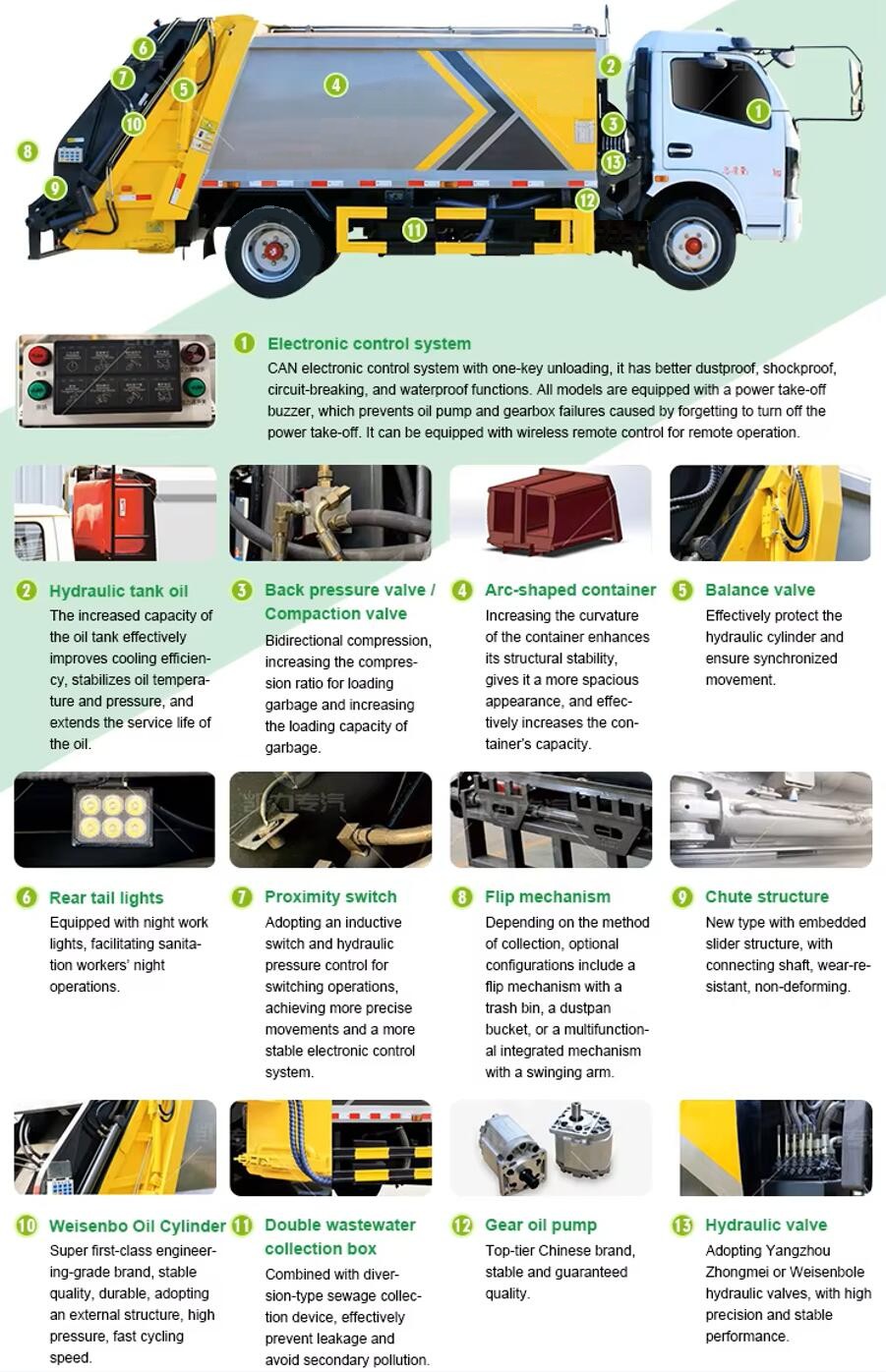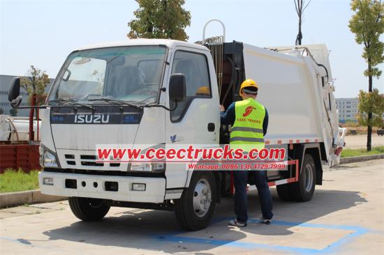 CEEC TRUCKS ผลิตรถบรรทุกแบบตักหลัง ISUZU NKR 6CBM ซึ่งมีประสิทธิภาพที่โดดเด่น การออกแบบที่สร้างสรรค์ และระบบปฏิบัติการอัจฉริยะ โดยค่อยๆ กลายเป็นผลิตภัณฑ์ดาวเด่นในด้านการทำความสะอาดในเมือง โดยสร้างขึ้นบนแชสซี ISUZU NKR 4×2 ซึ่งมีชื่อเสียงด้านความเสถียร ความทนทาน และความคล่องตัว โดยรถบรรทุกคันนี้มีขนาดโดยรวม 6,500×2,200×2,500 มม. ทำให้มีพื้นที่บรรทุกเพียงพอในขณะที่รองรับถนนที่แคบในเมือง ฐานล้อ 3,360 มม. และยางขนาด 7.00R16 ช่วยให้ขับขี่ได้นุ่มนวลขึ้นและควบคุมได้ดีขึ้น รถบรรทุกแบบตักหลัง ISUZU 6CBM มาพร้อมระบบควบคุม CAN-bus ขั้นสูง ซึ่งใช้วงจรตรรกะเพื่อให้แน่ใจว่าคำสั่งการทำงานจะดำเนินการตามลำดับในขณะที่ประสานกันเพื่อป้องกันอุบัติเหตุที่เกิดจากการทำงานผิดพลาด ลดการเกิดความล้มเหลว และเพิ่มความน่าเชื่อถือ ปุ่มเบรกฉุกเฉินที่ออกแบบมาเป็นพิเศษสามารถหยุดกลไกการบีบอัดขยะได้ในทุกสถานะหรือตำแหน่ง ช่วยให้มั่นใจในความปลอดภัยของผู้ปฏิบัติงานและอุปกรณ์และด้านล่างนี้แสดงรถบรรทุกอัดท้ายยี่ห้อ ISUZU สำหรับการโหลดถังขยะประเภทต่างๆ