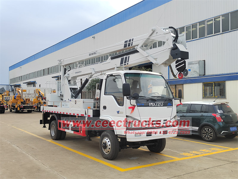 Folding arm aerial work platform with height 14mรถบรรทุกยกสูงพับได้ ISUZU NKR 14ม. เรียกอีกอย่างว่า รถเครนถัง, บูมลิฟท์, รถบรรทุกแพลตฟอร์มสูง, รถยกคนเคลื่อนที่, รถบรรทุกยกคนซึ่งเหมาะสำหรับการบำรุงรักษาสัญญาณไฟจราจร ไฟถนน ต้นไม้จัดสวน ทำความสะอาด/ตั้งป้ายโฆษณา และงานทางอากาศที่สูงอื่นๆรถกระเช้าอีซูซุสามารถจัดหาแพลตฟอร์มการทำงานบนอากาศบนรถบรรทุก ISUZU NKR ตั้งแต่ 6ม.-8ม., 8ม.-12ม., 14ม.-16ม. ในรูปแบบแขนพับ นอกจากนี้ยังมีแบบ 10-14ม. ให้เลือกอีกด้วย14ม.-16ม.,18ม.-20ม., 20-24ม., 28ม.-32ม. เป็นแบบแขนตรง ตะกร้าหุ้มฉนวนเป็นตัวเลือกสำหรับฉนวนปกติที่ทำงานด้วยไฟ 220V นอกจากนี้ยังสามารถปรับแต่งด้วยบูมและตะกร้าที่ทำจากวัสดุไฟเบอร์กลาส ซึ่งสามารถใช้ทำงานได้สูงสุด 46KV
