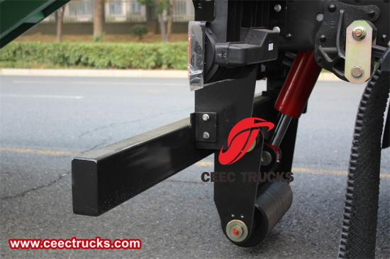 ขั้นตอนที่ 8. ดึงด้ามจับควบคุมแขนขึ้นไปที่ตำแหน่งยืดออก กระบอกสูบแขนจะยืดออก แขนที่เคลื่อนที่ได้จะหมุนรอบเพลาบานพับด้านหน้าของเฟรมพลิก และถังขยะจะพลิกและเอียงลงพร้อมกับแขนที่เคลื่อนที่ได้ เมื่อวางถังขยะห้ามยืนบริเวณท้ายรถโดยเด็ดขาด