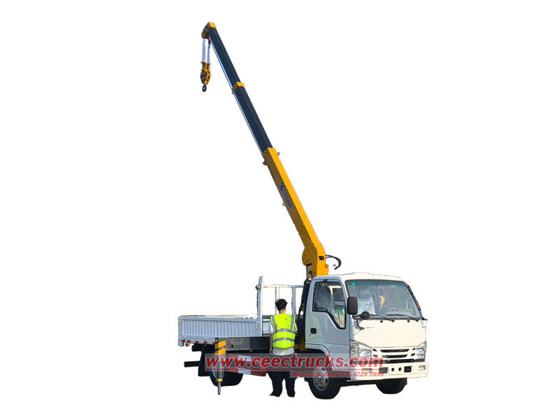 เครนสามารถเลือกได้ว่าจะติดตั้งแบบแขนตรงหรือแบบแขนพับ เครนติดรถบรรทุก Isuzu ประกอบด้วยบูม โต๊ะหมุน โครง ขา และชิ้นส่วนอื่นๆ