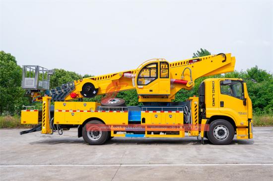 7-section fourteen-sided synchronous telescopic armรถกระเช้า ISUZU FTR 45 ม. เป็นรถบรรทุกพิเศษทางวิศวกรรมระดับมืออาชีพที่ผสานประสิทธิภาพทางเทคนิคที่ยอดเยี่ยมและการออกแบบเพื่อความปลอดภัย รถบรรทุกคันนี้ใช้แชสซีส์ ISUZU New GIGA FTR เป็นหลัก โดยติดตั้งเครื่องยนต์ 4HK1-TC60 ที่ให้กำลังขับเคลื่อนสูงสุด 205 แรงม้า และมวลรวมของรถ 18,000 กก. รถบรรทุกกระเช้า Isuzu FTR มีความสูงในการทำงานสูงสุด 45 เมตร ความสูงของแพลตฟอร์มอยู่ที่ 27 เมตรจากพื้นดิน รัศมีการทำงานสูงสุด 7 เมตร และระบบสมดุลแบบสถิตไฮดรอลิกเพื่อให้มั่นใจถึงความเสถียร