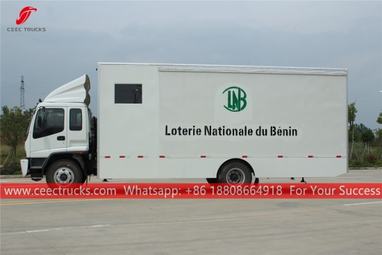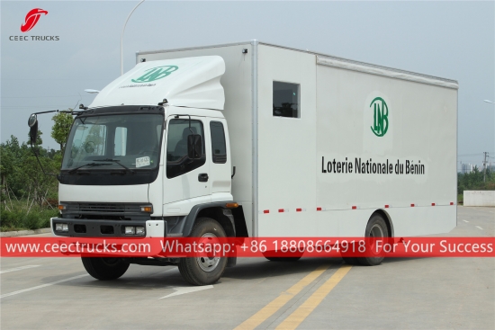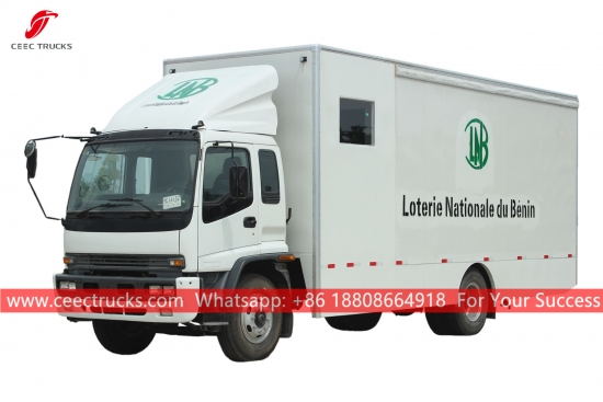 รถบรรทุกแสดงสินค้าเคลื่อนที่บนเวที ISUZU แชสซี ISUZU FTR เกียร์ธรรมดา MLD 6 เกียร์ เครื่องยนต์ดีเซล ISUZU 205 แรงม้า ขนาดตัวถังรถตู้เป็นอุปกรณ์เสริม งานพ่นสีและโลโก้ขึ้นอยู่กับข้อกำหนด