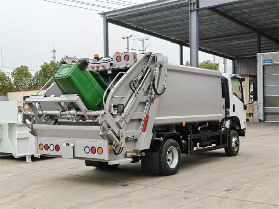 กลไกการโหลด กลไกการแขวนถังพลิกด้านหลังสามารถปรับให้เข้ากับถังขยะมาตรฐานขนาด 240 ลิตรหรือ 660 ลิตร โหลดอัตโนมัติด้วยปุ่มเดียว และทิ้งขยะทีละชิ้นเสร็จภายใน 15 วินาทีนักแสดงชายกลไกการดันพลั่วและมีดขูดจะบีบอัดขยะทั้งสองทิศทาง อัตราส่วนการบีบอัดสามารถเข้าถึง 1:3 และฟังก์ชันการอัดแบบลูกกลิ้งที่ควบคุมโดย PLC สามารถเพิ่มความสามารถในการรับน้ำหนักได้